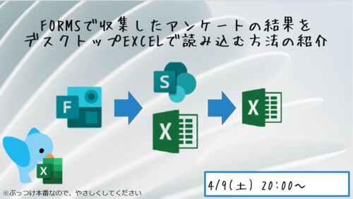 Microsoft365の機能の一つであるFormsのアンケートフォームを使って情報を収集し、その結果をデスクトップアプリのExcelへ読み込むことで、データをVBA等で使いやすい状態にする方法を、先日Zoomで説明させて頂きました。 資料を準備せずに開催したので、本…